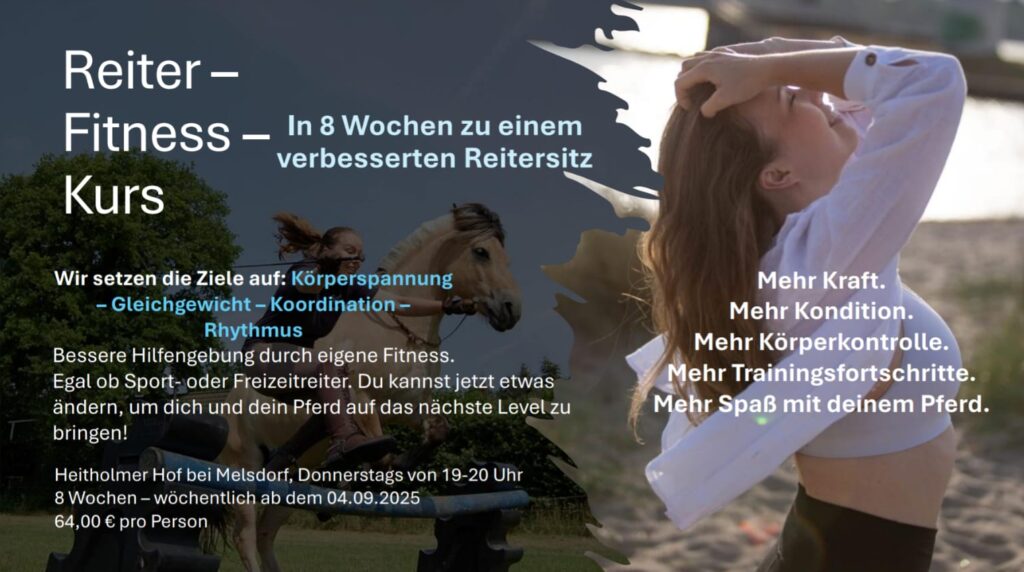 Der neue Reiter Fitness Kurs auf dem Heitholmer Hof startet am 04.September 2025 und findet 8 Wochen lang immer Donnerstags von 19-20 Uhr statt. Anmelden könnt Ihr euch über folgenden Link: