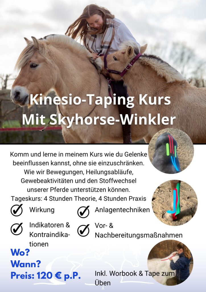 Komm und lerne in meinem eintägigen Taping-Kurs wie du Gelenke beeinflussen kannst, ohne sie einzuschränken. Wie du Bewegungen, Heilungsabläufe, Gewebeaktivität und sogar den Stoffwechsel des Pferdes unterstützen kannst. Kinesio-Taping Pferd – jetzt Grundlagen schaffen und vielleicht später gemeinsam ausbauen.